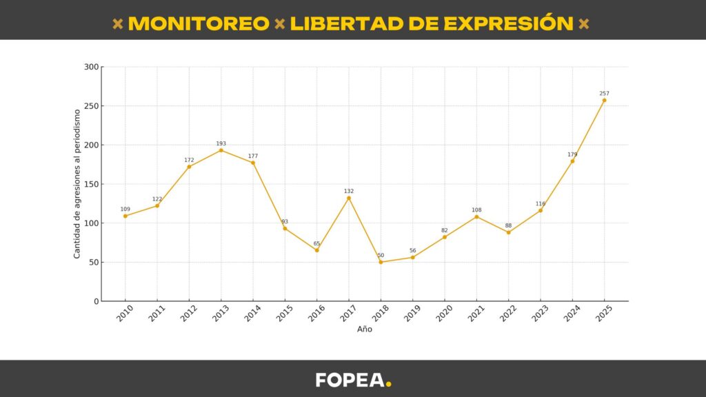 Al exponer los datos del Monitoreo de Libertad de Expresión de FOPEA, Moreno citó cifras alarmantes: en 2024 se registraron 179 casos de ataques, lo que representa un aumento de 53 % respecto a 2023 y de 103 % frente a 2022. Además, en lo que va del 2025 ya hay un récord de 257 casos, superando incluso las cifras del año 2013.