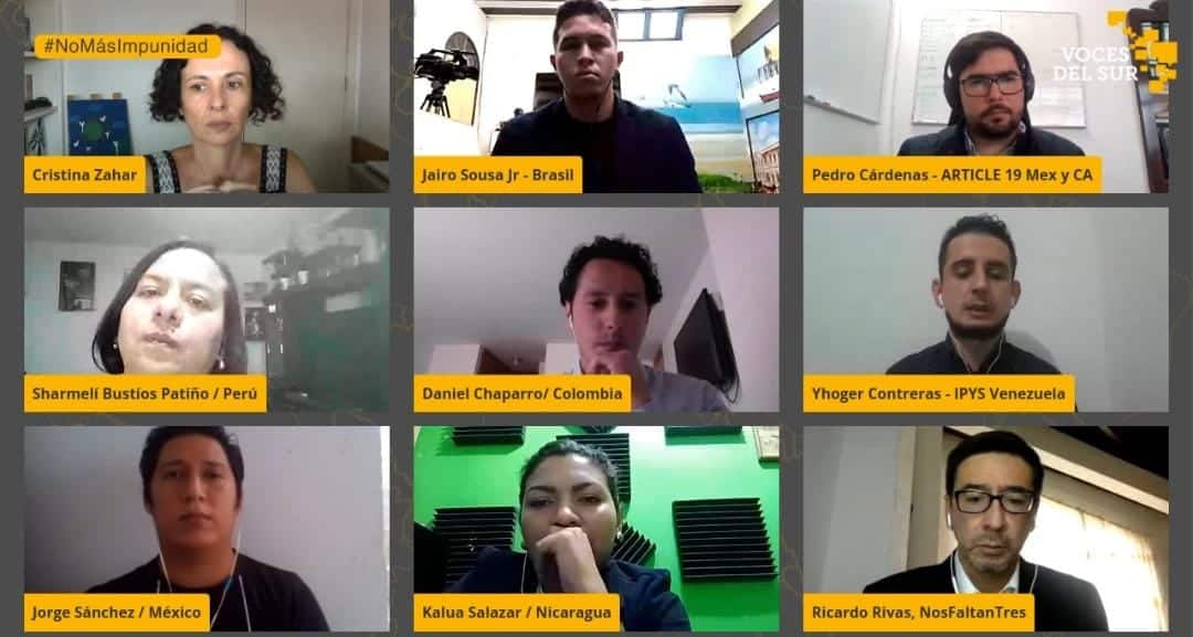 El colectivo Voces del Sur realizó el 18 de febrero de 2021 el Foro virtual: 2020, otro año de impunidad por crímenes y agresiones contra periodistas en la región. Reunió siete casos emblemáticos de siete países con testimonios de familiares y protagonistas quienes contaron su lucha contra la impunidad y los avances o retrocesos en las investigaciones en los últimos meses.